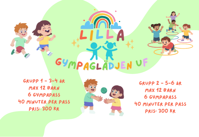 Lilla Gympaglädjen UF erbjuder lekfulla gympapass för barn mellan 3–6 år. Passen innehåller hinderbanor, lekar och rörelseövningar som utvecklar barnens motorik, balans och ger dem rörelseglädje. Varje kurs består av 6 pass på 40 minuter och kostar 300 kr. Grupperna är uppdelade i 3–4 år och 5–6 år, med maximalt 12 barn per grupp. Syftet är att ge barn en trygg, rolig och inkluderande introduktion till fysisk aktivitet där alla kan delta på sin egen nivå.