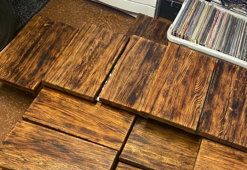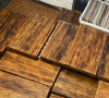 Vi säljer handgjorda skärbrädor av återvunnet bord. Varje bräda är unik och tillverkad av massivt trä från återvunna bord, med en robust och stabil design. Ytan är bränd för ett personligt uttryck och oljad för lång hållbarhet. Priset är 349 kr.