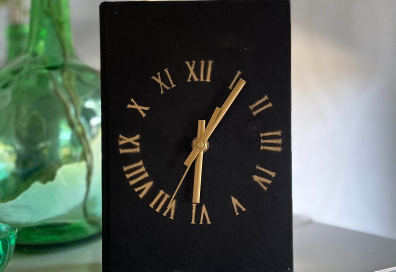 Stilren klocka skapad av återvunnen bok och urverk.