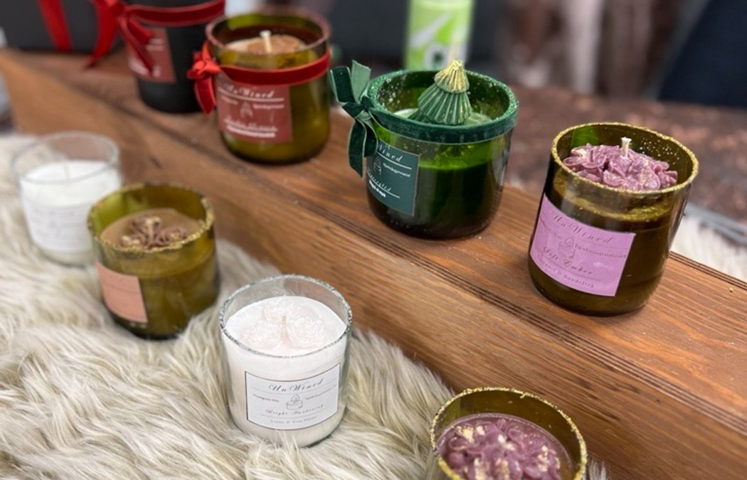 Vi säljer handgjorda och återbrukade doftljus utav vinflaskor.