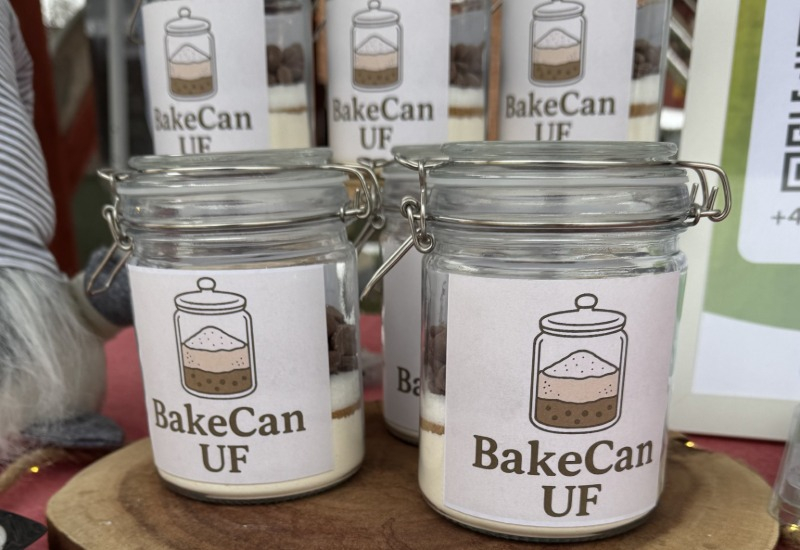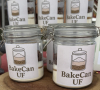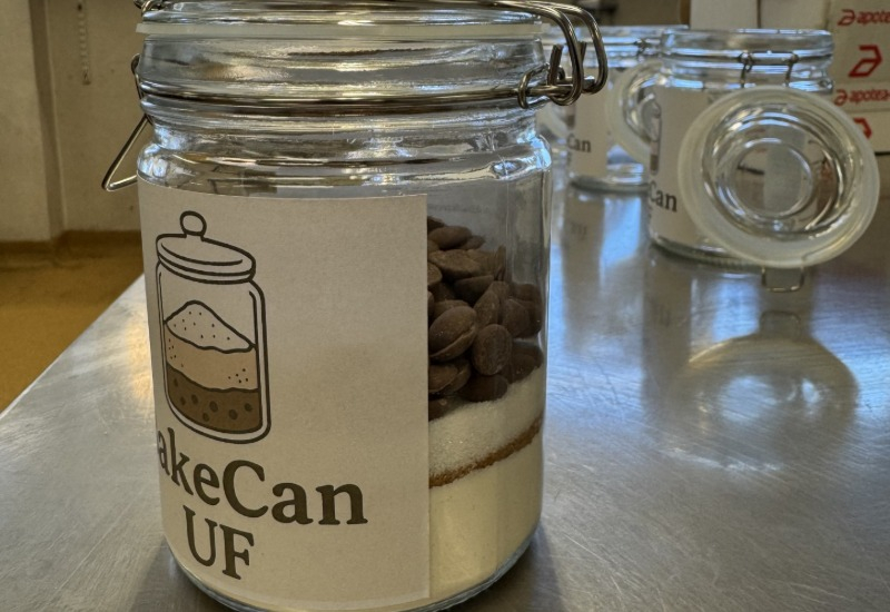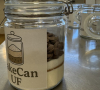 En glasburk fylld med torra ingredienser för att baka en sats Chocolate Chip Cookies. Tillsätt endast smör och ägg. På baksidan finns det en innehållsförteckning och instruktioner.