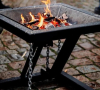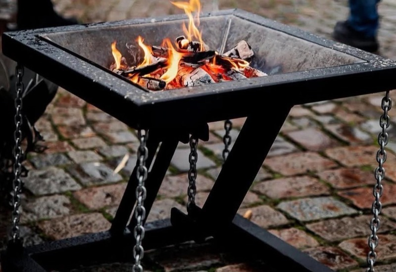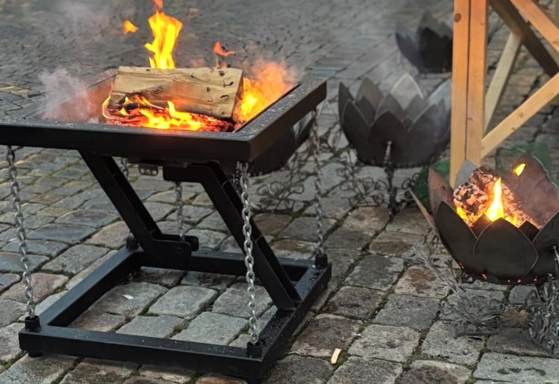 En eldkorg med unik design som kallas tensegritet vilket betyder att den hålls upp av spända kedjor som ger den en illusion om att den svävar