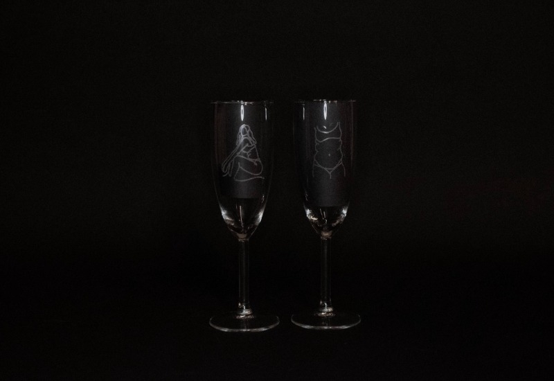 Elegant set med två unika champagneglas, var och en prydd med ett vackert kvinnomotiv. Perfekt som present, för att förgylla middagsdukningen med en personlig touch eller som en unik, men stilren inredningsdetalj.
