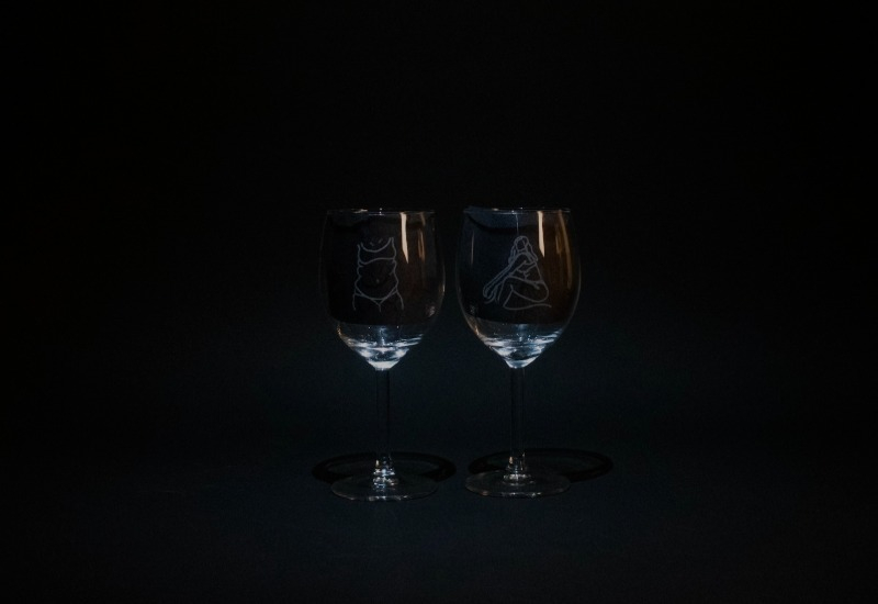 Elegant set med två unika vinglas, var och en prydd med ett vackert kvinnomotiv. Perfekt som present, för att förgylla middagsdukningen med en personlig touch eller som en stilren inredningsdetalj.
