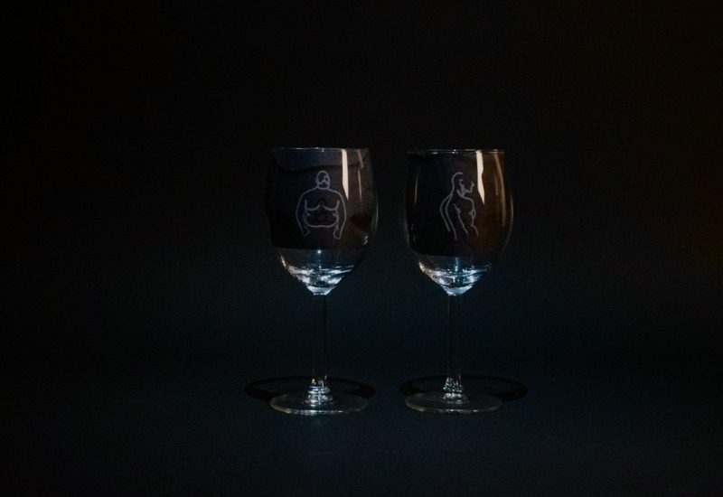 Elegant set med två unika vinglas, var och en prydd med ett mansmotiv. Perfekt som present, för att förgylla middagsdukningen med en personlig touch eller som en stilren inredningsdetalj.