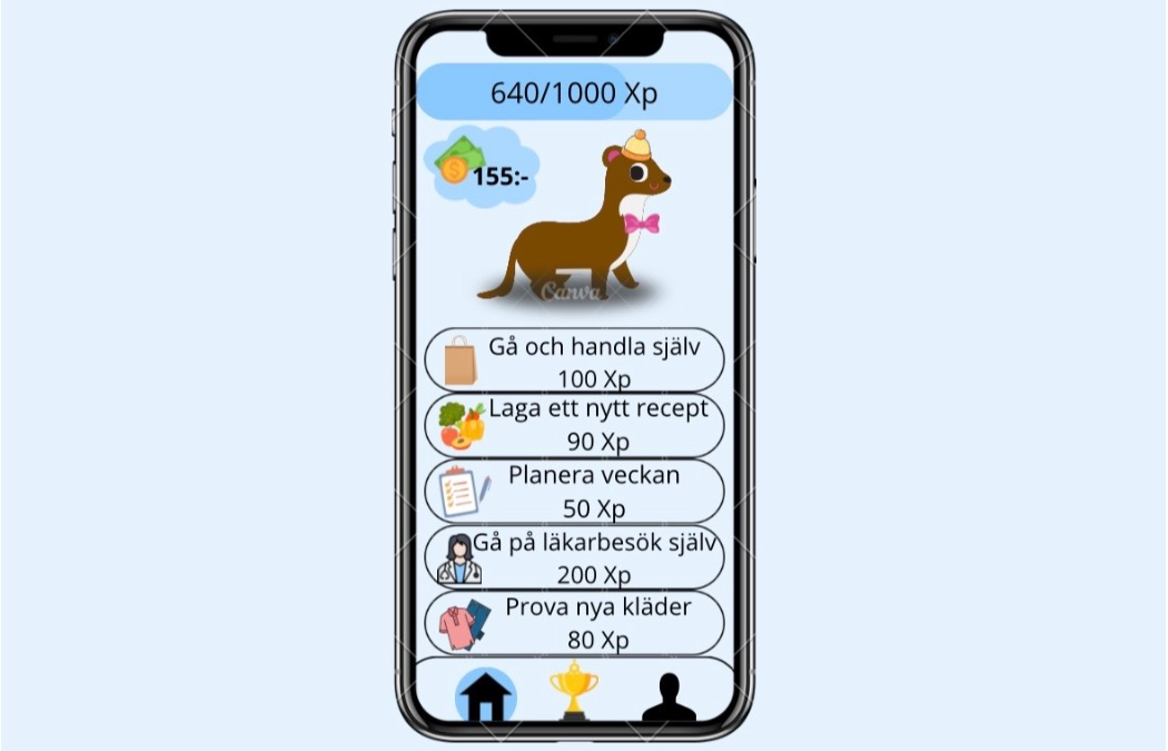 Vi är fem tjejer som utvecklar en prototyp av en app utformad för individer med NPF-diagnos. Tanken är att användaren ska få öva upp färdigheter som främjar självständighet. Appen bygger på att utföra utmaningar som hjälper användaren att utsätta sig för nya saker. Det kan vara saker som att handla själv, prova ny mat eller prata med nya personer. När man klarat en utmaning så tjänar man poäng, går upp i nivå och kan därefter belöna sig med kläder och accessoarer till sin spelkaraktär.