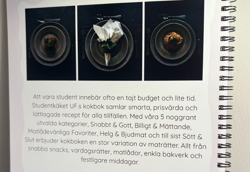 Studentkäket UF:s kokbok är framtagen för studenter som lever på CSN och en tajt budget, men som samtidigt vill njuta av god, enkel och billig mat. I kokboken hittar du recept som både sparar pengar och tid samt med råvaror som är enkla att hitta i din lokala matbutik. Kokboken består av 5 kategorier som är noggrant genomtänkta för att skapa den perfekta kokboken. Kategorierna är snabbt och gott, billigt och mättande, matlådevänliga favoriter, helg och bjudmat och till sist sött och slut.
