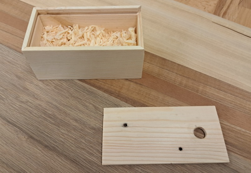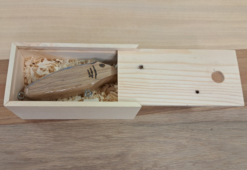 Vi säljer tre olika typer av fiskebeten som vi tillverkat ut av Ek till dom får man en låda som är tillverkad av återvunnen ut av gamla lastpallar.