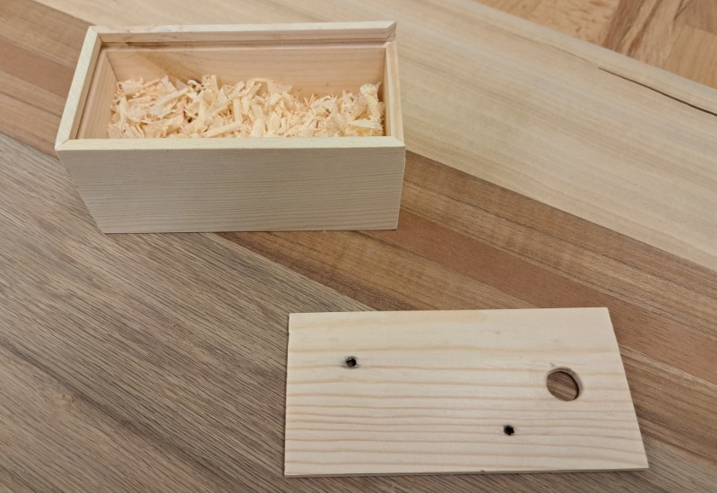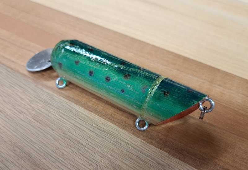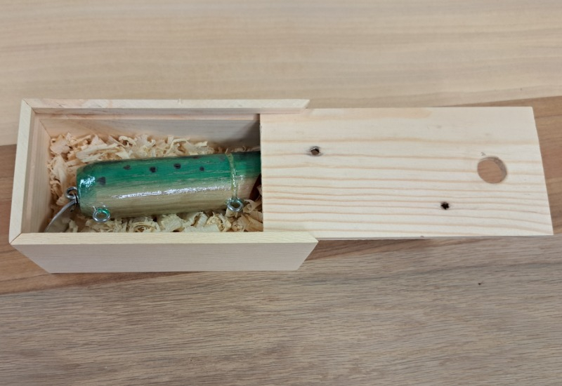 Vi säljer tre olika typer av fiskebeten som vi tillverkat ut av Ek till dom får man en låda som är tillverkad av återvunnen ut av gamla lastpallar.