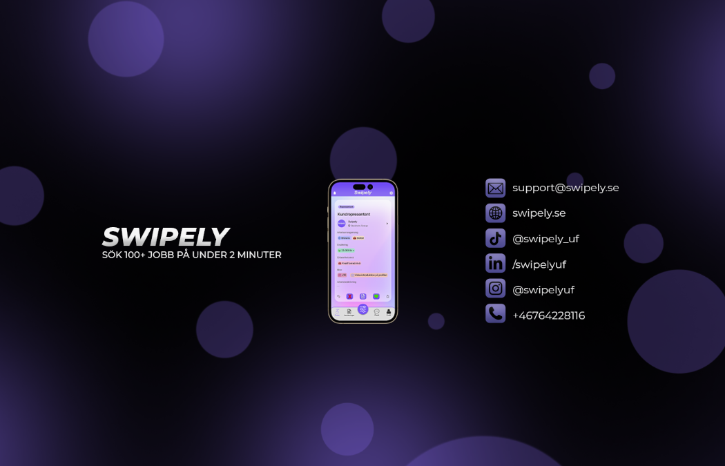 I så fall är Swipely appen för dig! Swipely är en helt gratis app som tillåter arbetssökande att svepa över skärmen för att ansöka till jobb! Konceptet kommer från den välkända appen Tinder. Med Swipely kan du ansöka till 100+ jobb på under 2 minuter - och det bästa? Appen är HELT GRATIS. Läs mer om oss på Swipely.se!