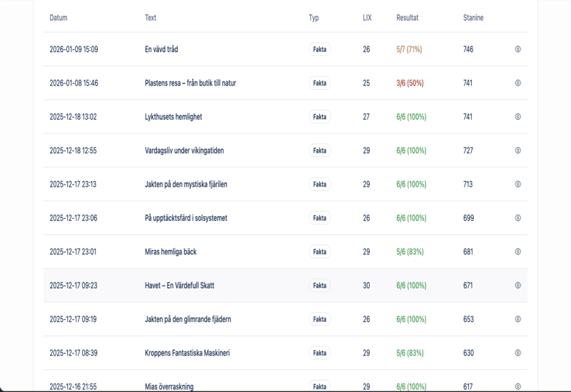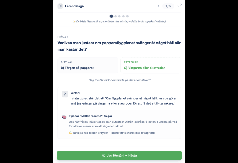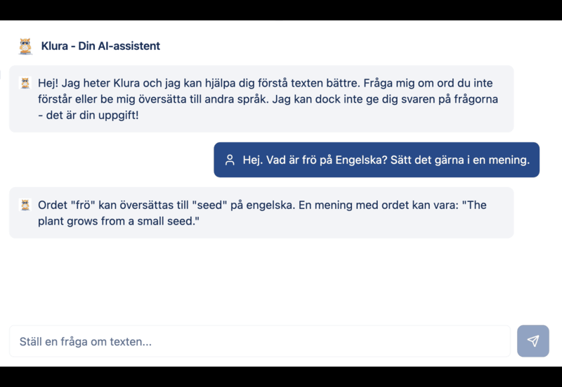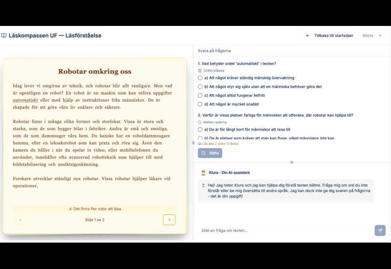 Vi säljer ett digitalt läromedel för läsförståelse med individanpassade texter och frågor, AI-baserat stöd kopplat till skolans styrdokument (LGR22) och direktåterkoppling till eleven. För lärare och föräldrar finns en administratörsvy där de kan se elevens styrkor och svagheter samt utvecklingskurva. Plattformen säljs till vårdnadshavare genom månadsprenumeration och till skolor via skollicenser per termin.