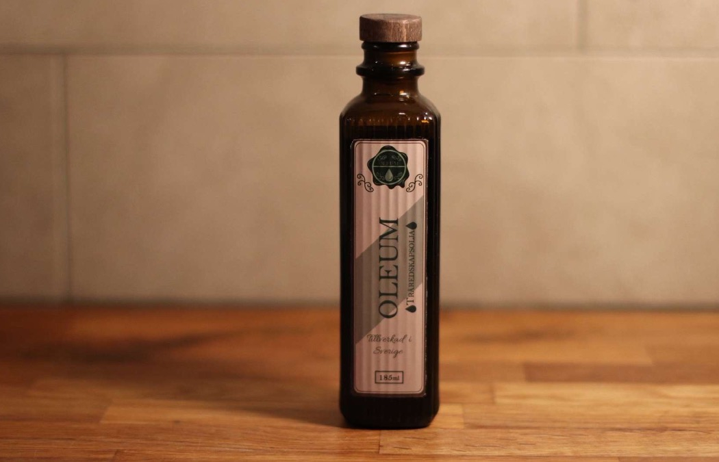 Vår produkt är en naturlig träolja. Receptet består av hampfröolja, MCT-olja och E-vitamin. Den paketeras i en återbrukad glasflaska med en stilren design och försluts med korkar i trä. Vår träolja vårdar träet, bevarar kvalité, förebygger slitage och förlänger dess livslängd. Passar för såväl skärbrädor, såväl skevar, gafflar och andra redskap av trä.