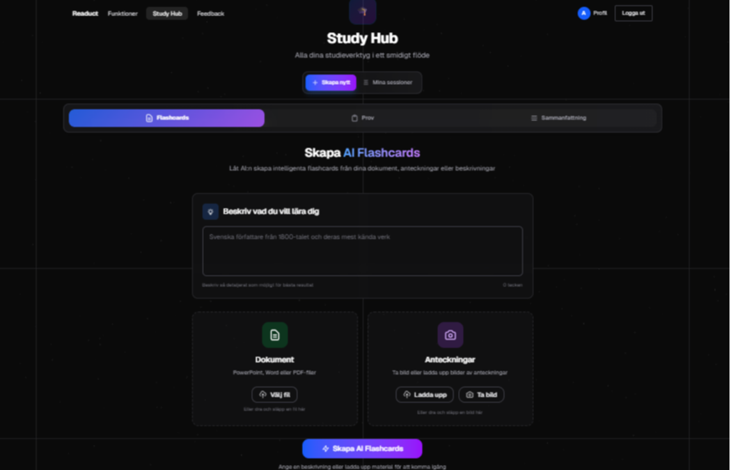 Readuct UF är ett digitalt verktyg som gör plugget lättare. Du laddar upp dina PDF:er, PowerPoints, Word-filer eller anteckningar, och tjänsten omvandlar dem automatiskt till studiematerial.