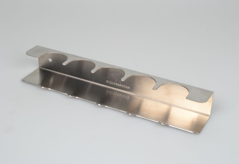 fritt stål. Stället rymmer fem kryddor och har fem krokar för upphängning av mindre köksredskap.