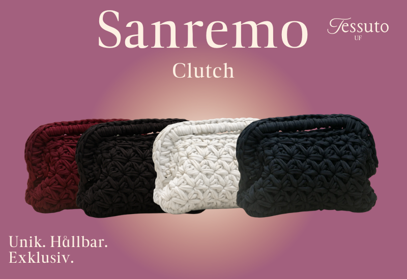 Sanremo är vår första och mest ikoniska produkt. En handvirkad clutch som kombinerar stil och hållbarhet. Den rymmer det viktigaste för både vardag och fest, mobil, plånbok, nycklar och små tillbehör. Sanremo kännetecknas genom vårt blommönster. Varje clutch virkas av återvunnet material, vilket gör den till ett modernt och medvetet alternativ för den som vill bära något både exklusivt och klimatsmart.