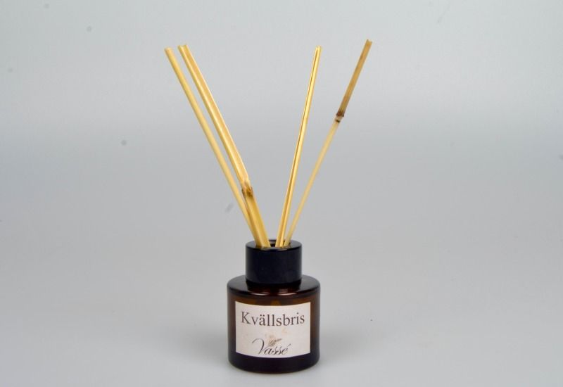 Doftpinnar på vass med eterisk apelsin och cedeträolja som sprider en doft av mjuka trätoner i rummet.