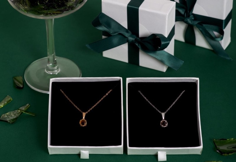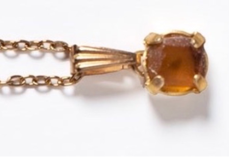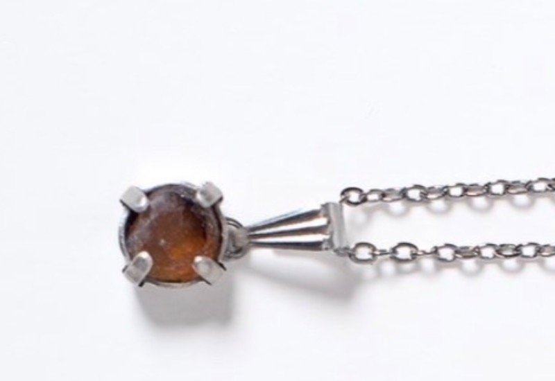 Handgjorda halsband gjorda av återvunna glasflaskor. Vitrias bruna halsband är gjort av en gammal ölflaska.