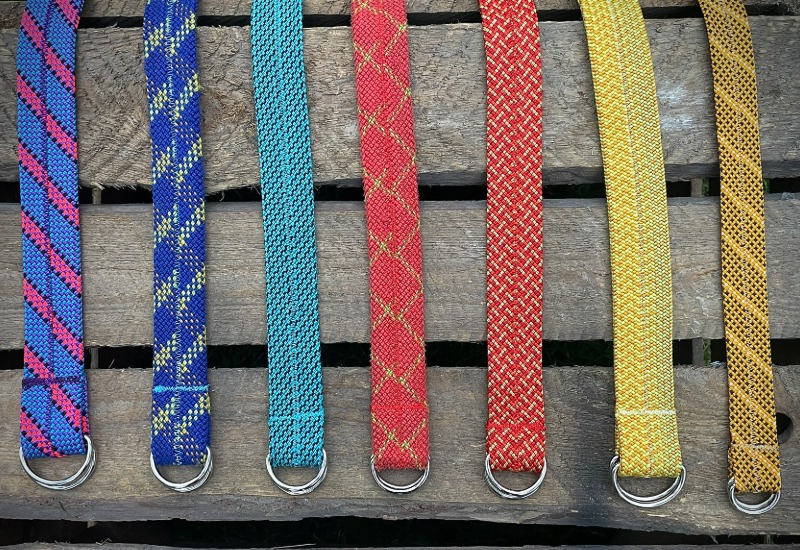 Våra bälten tillverkas av återbrukade klätterrep som inte längre uppfyller säkerhetskraven för klättring – men som fortfarande är extremt slitstarka. Varje bälte är handgjort och unikt, med sin egen historia från berg och äventyr.