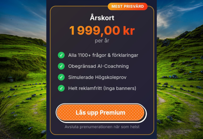 Årskortet för 1 999 kr ger full tillgång till 2.0 Learning under ett helt år. Användaren får obegränsad åtkomst till alla högskoleprovsfrågor, AI-coachning med personliga förklaringar, simulerade högskoleprov och målstyrd träning – helt utan reklam. Årskortet är utformat för maximal utveckling över tid och passar elever som satsar på ett högt resultat.