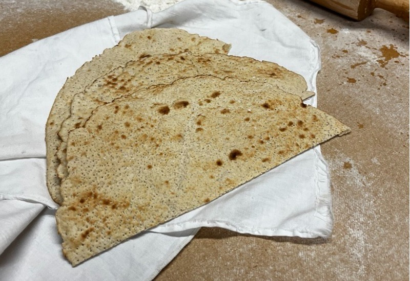 Ett mjukt hembakt tunnbröd där vi även erbjuder alternativ smaksättning. Vi säljer i två smaker, naturellt och ett bröd med smaken av vitlök, timjan och rosmarin. Brödet är bakat i lokal bagarstuga i vedeldad ugn.