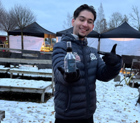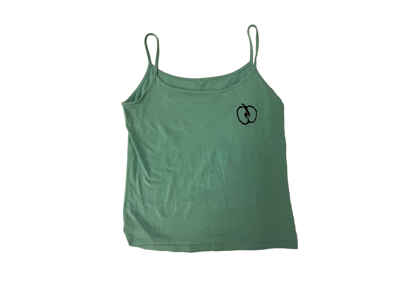 Ett turkos dam linne i M storlek med ett litet äpple. Kontakta oss på Instagram för att köpa!