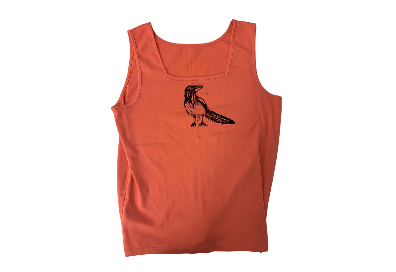 Ett korall dam linne i L storlek med en fin Skata. Kontakta oss på Instagram för att köpa!