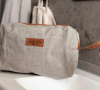 En handgjord, stilren och praktisk necessär i 100% linne med läder detaljer. (Finns i flera färger)