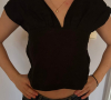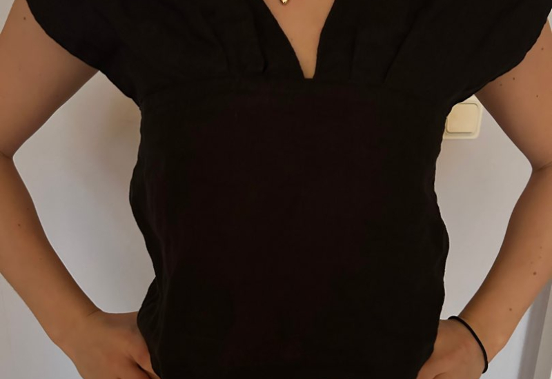 Svart topp i linnematerial med v-ringning fram samt öppen i ryggen.