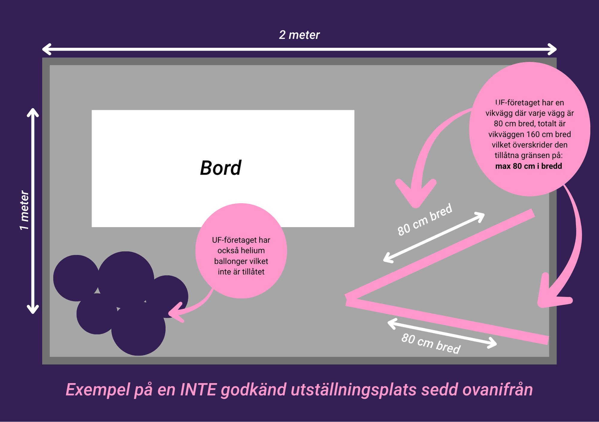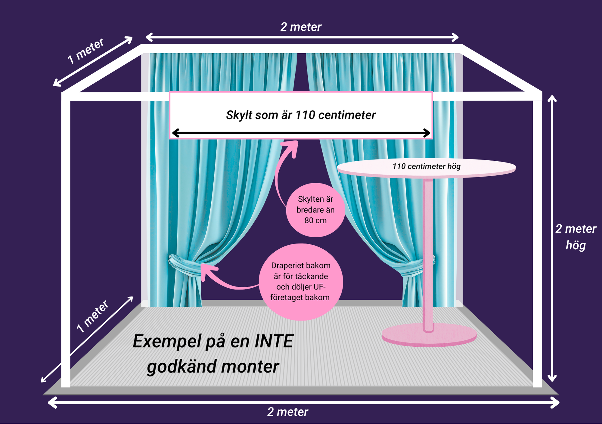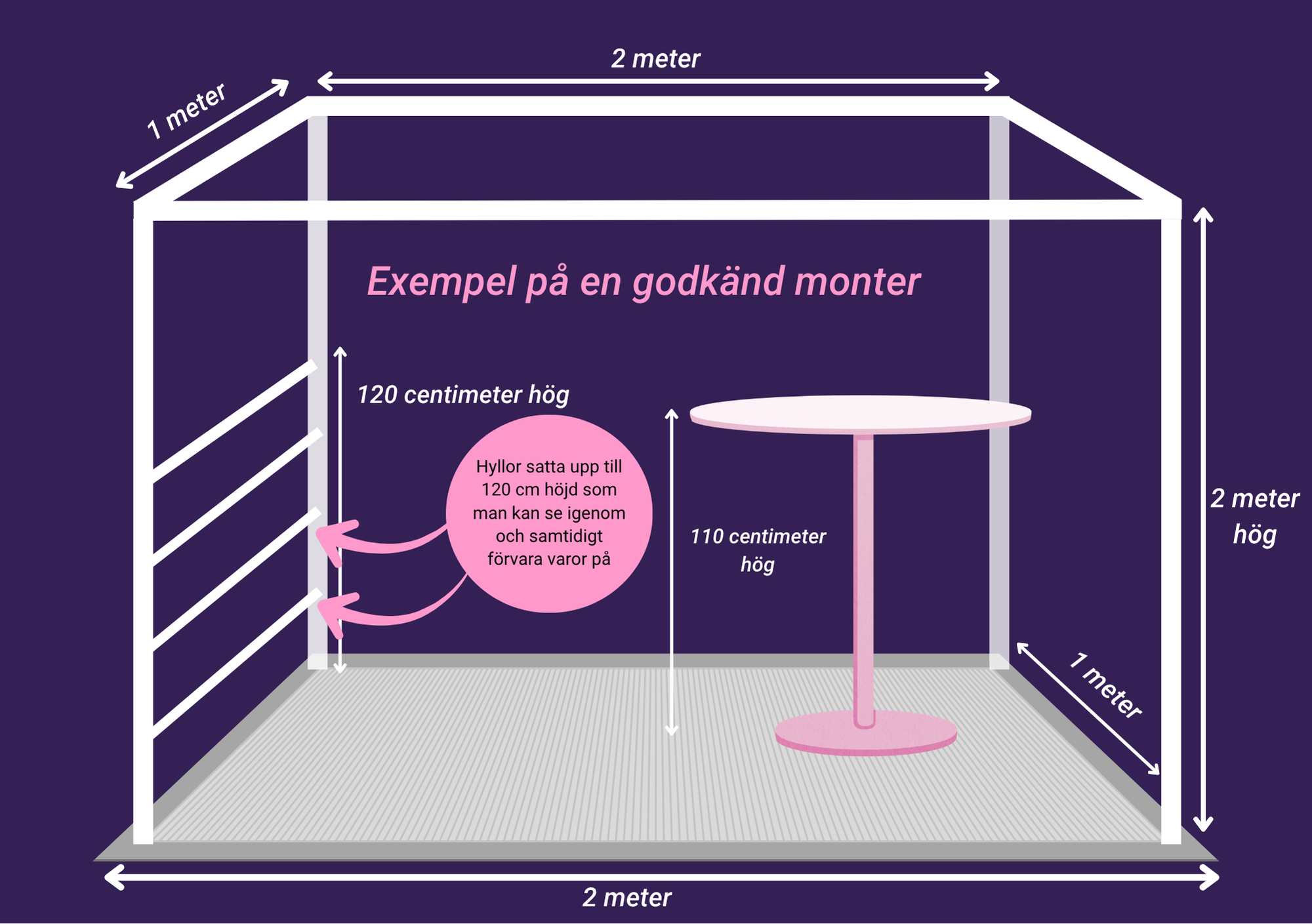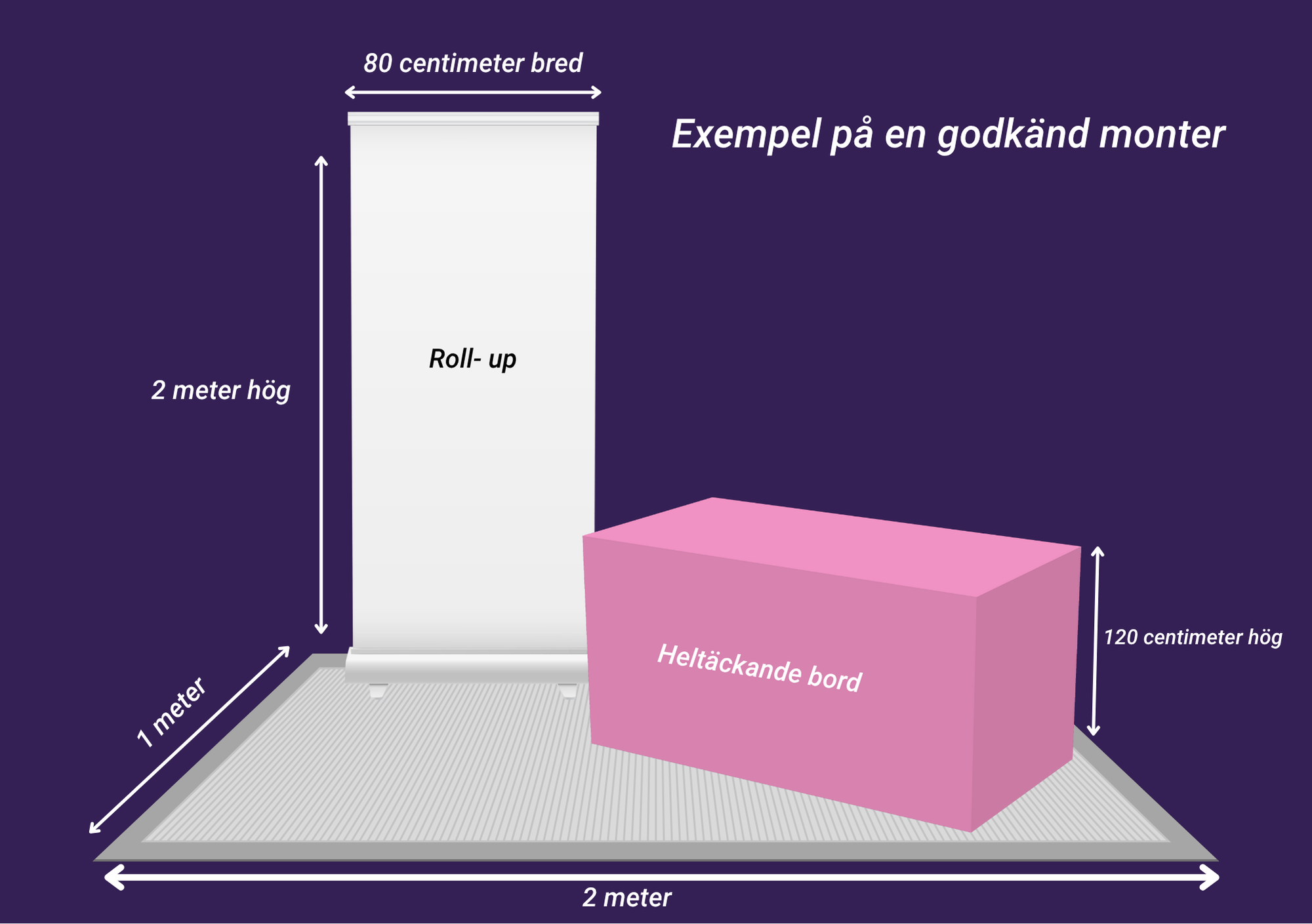 - Inredning som är under 120 cm hög får vara hur bred som helst, men den får inte gå utanför utställningsplatsen dvs. 1 x 2 meter.