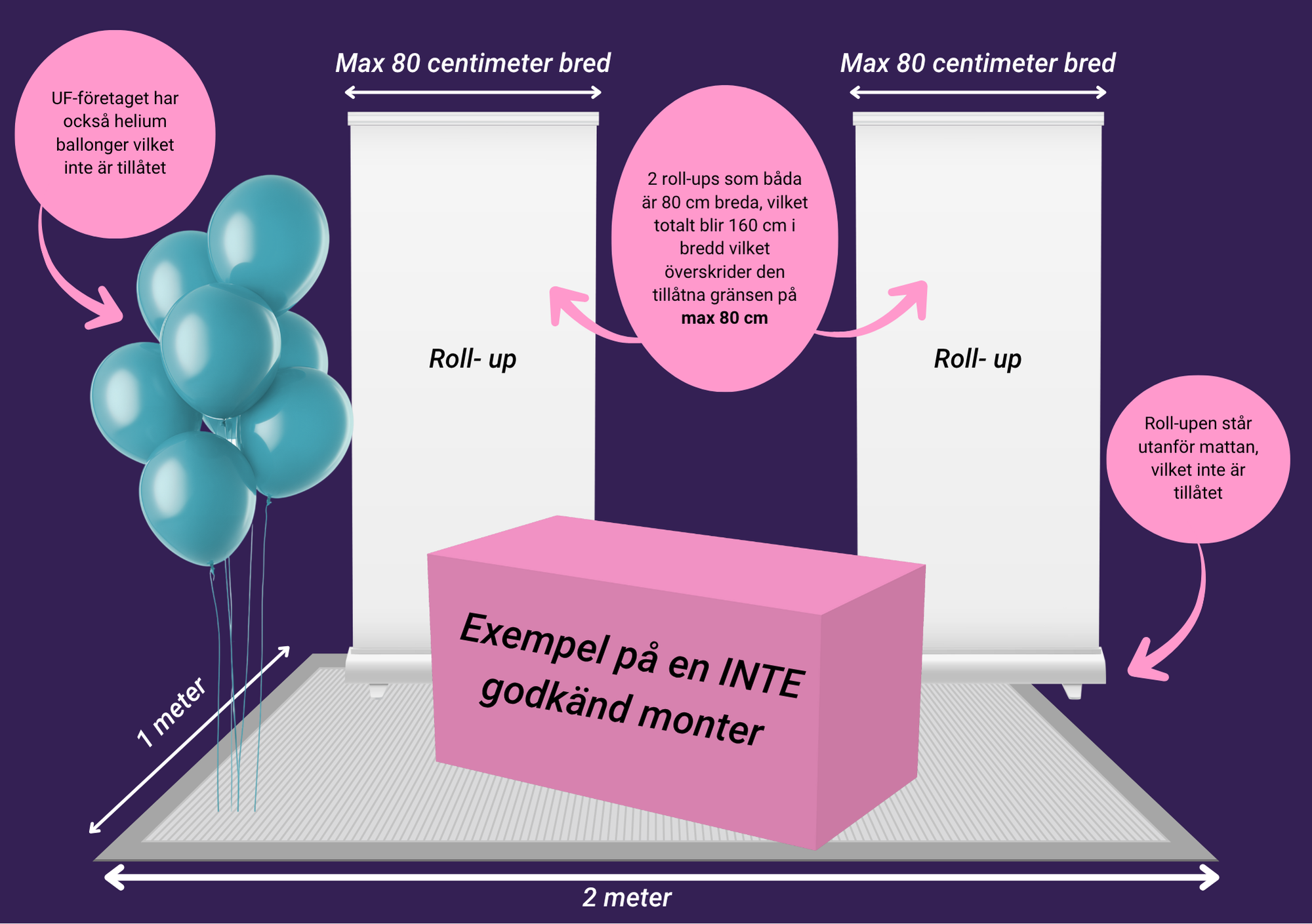 I mässanmälan ingår er utställningsplats på 1x2 kvadratmeter, samt en antrasitgrå matta som ramar in er utställningsplats. Det kommer finnas mässplatser med eller utan el beroende på vad ert UF-företag har önskat. För att få en mässplats med el måste ni ha angett det i er mässanmälan och då tillkommer en avgift på 450kr.