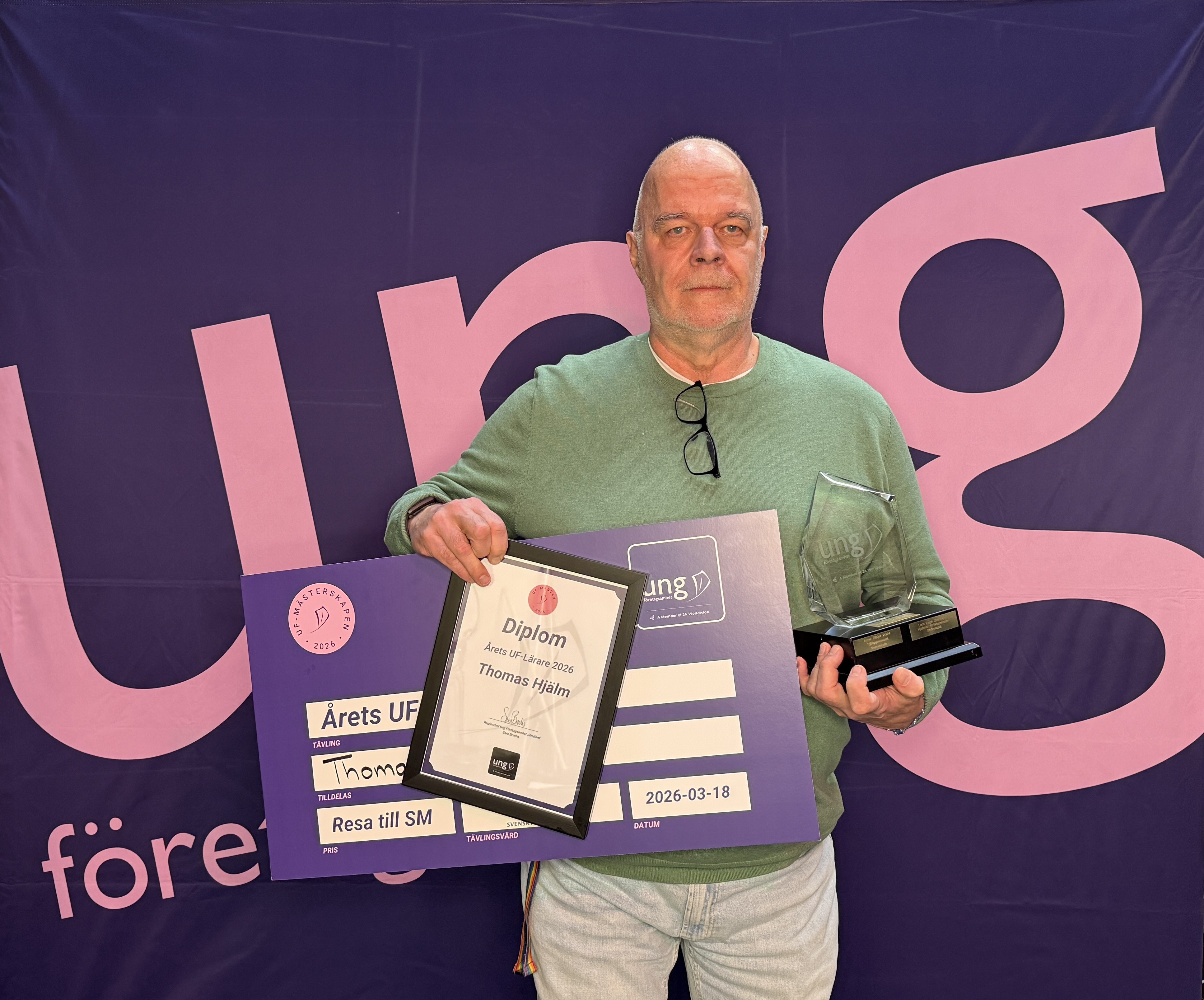 Motivering: "Årets UF-lärare är en person som under många år har inspirerat elever att våga tro på sina idéer och testa sina vingar som entreprenörer. Med stort engagemang, lång erfarenhet och en genuin omtanke om sina elever finns den här lärare alltid där, redo att lyssna, bolla idéer och ge kloka råd längs vägen. Med en fin balans mellan stöd och självständighet får eleverna både trygghet och mod att utveckla sina egna företag. Resultatet är en lärmiljö där kreativitet, driv och entreprenörskap får växa på riktigt. Genom initiativ som internationella samarbeten, tävlingar och starka kopplingar till näringslivet har eleverna dessutom fått möjligheten att se sina idéer i ett större sammanhang. Med sitt engagemang, sitt driv och sin förmåga att inspirera gör årets UF-lärare verklig skillnad - för sina elever, för skolan och för framtidens entreprenörer. Stort grattis till Årets UF-lärare Thomas Hjälm."