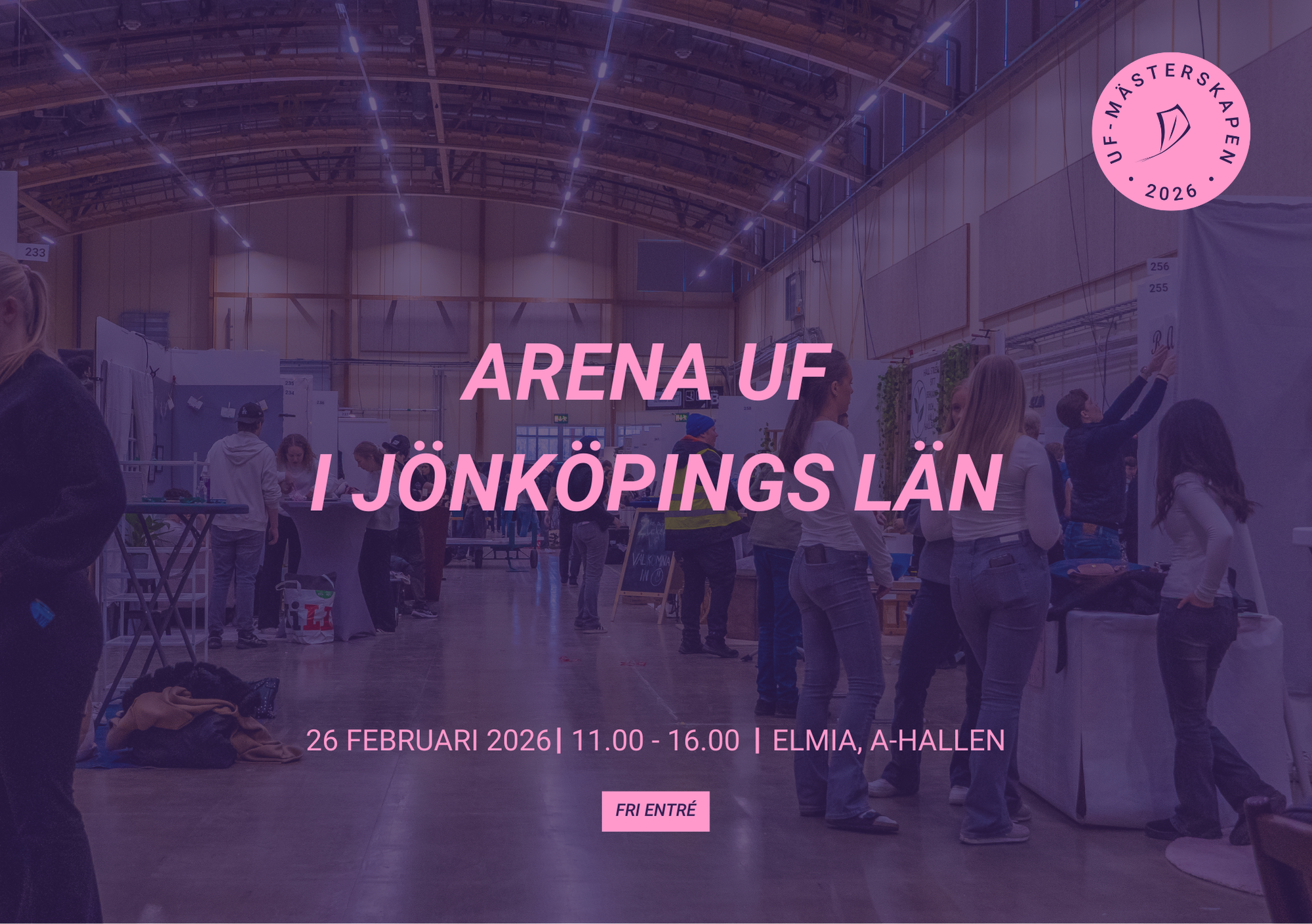 Den 26 februari är det återigen dags för vår regionala mässa, Arena UF i Jönköpings län på Elmia. Omkring 350 UF-företag ställer ut på mässan och 1100 gymnasieelever från hela Jönköpings län ställer ut, visar upp sina affärsidéer och säljer sina varor eller tjänster. Under dagen pågår också UF-mästerskapen där företagen har möjlighet att tävla i flertalet kategorier, allt från vem som har den bästa varan, det mest hållbara UF-företaget eller vem som är den bästa säljaren. Vinnaren i flertalet av kategorierna kvalificerar sig till SM i Ung Företagsamhet i Stockholm i maj.