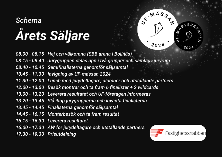 - Det kommer stå en personal utanför rummet som tar emot de tävlande och skickar in och ut dem. Den kommer ha koll på 20 minutersintervallen, ni ansvarar för UF-företagens säljsamtalstid (5 minuter).