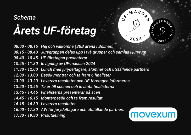 - 13.45 -14.45 Presenterar UF-företagen och har 10 minuters tidsåtgång var. Därför ställs inga direkta frågor till UF-företagen utan det kan ni göra vid montern senare.